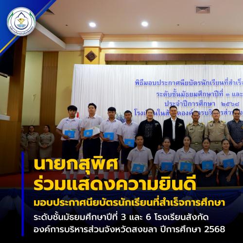 “นายกสุพิศ” ร่วมแสดงความยินดี มอบประกาศนียบัตรให้นักเรียน ม.3 และ ม.6 โรงเรียนสังกัดองค์การบริหารส่วนจังหวัดสงขลา ประจำปีการศึกษา 2568 จำนวน 142 คน