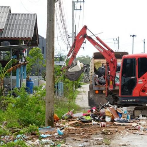 อบจ.สงขลา เร่งแก้ปัญหาขยะสะสมชุมชนโชคสมานหาดใหญ่ ฉีดพ่นดับกลิ่นหลังน้ำลด