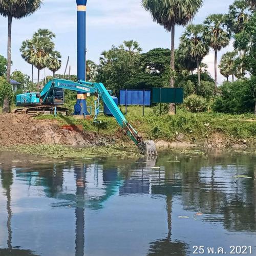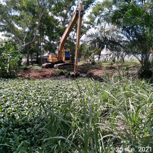 สำนักการช่าง อบจ.สงขลา นำรถแบคโฮเข้ากำจัดวัชพืชในสระผลิตน้ำประปา บริเวณหน้า อบต.ท่าหิน อ.สทิงพระ จ.สงขลา