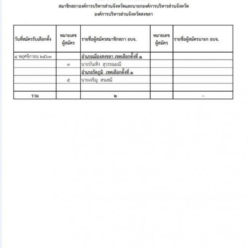รายงานผลการสมัครรับเลือกตั้งนายกองค์การบริหารส่วนจังหวัดสงขลา และสมาชิกสภาองค์การบริหารส่วนจังหวัดสงขลา วันที่ 2 พ.ย.63