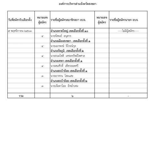 รายงานผลการสมัครรับเลือกตั้งนายกองค์การบริหารส่วนจังหวัดสงขลา และสมาชิกสภาองค์การบริหารส่วนจังหวัดสงขลา วันที่ 6 พ.ย.63