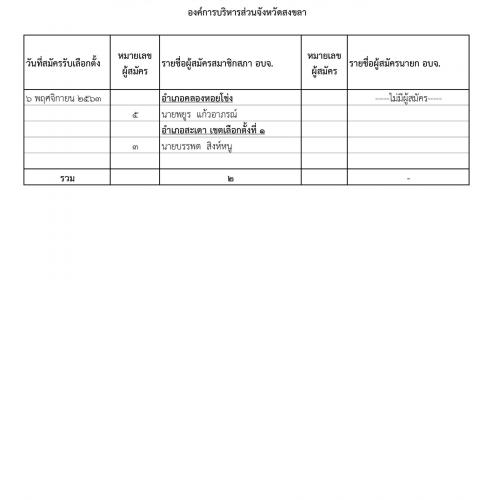 รายงานผลการสมัครรับเลือกตั้งนายกองค์การบริหารส่วนจังหวัดสงขลา และสมาชิกสภาองค์การบริหารส่วนจังหวัดสงขลา วันที่ 3 พ.ย.63