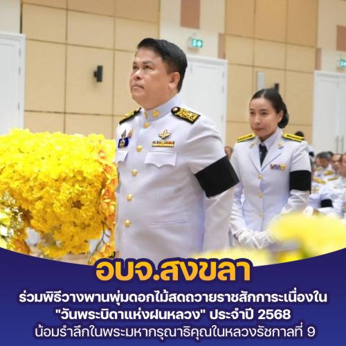 อบจ.สงขลา ร่วมพิธีวางพานพุ่มดอกไม้สดถวายราชสักการะเนื่องใน "วันพระบิดาแห่งฝนหลวง" ประจำปี 2568 น้อมรำลึกในพระมหากรุณาธิคุณในหลวงรัชกาลที่ 9