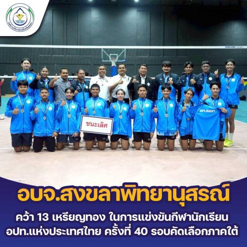 ทัพนักกีฬาโรงเรียน อบจ.สงขลาพิทยานุสรณ์ คว้า 13 เหรียญทอง ในการแข่งขันกีฬานักเรียน อปท.แห่งประเทศไทย ครั้งที่ 40 รอบคัดเลือกภาคใต้ " ลิกอร์เกมส์ "