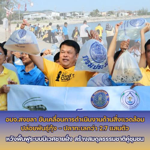 อบจ.สงขลา ขับเคลื่อนการดำเนินงานด้านสิ่งแวดล้อม ปล่อยพันธุ์กุ้ง-ปลาทะเลกว่า 2.7 แสนตัว หวังฟื้นฟูระบบนิเวศชายฝั่ง สร้างสมดุลธรรมชาติคู่ชุมชน
