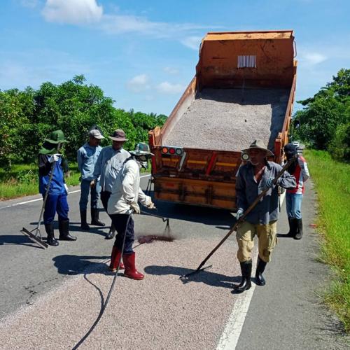 สำนักช่าง อบจ.สงขลา นำเครื่องจักรและวัสดุลงพื้นที่งานซ่อมลาดยาง ถนนสายหลัก บ้านหนำคอก ตำบลท่าโพธิ์ อำเภอสะเดา จังหวัดสงขลา