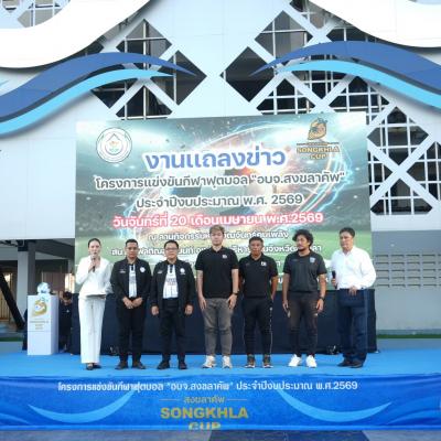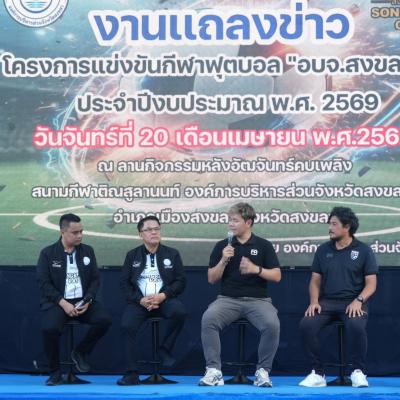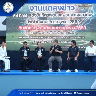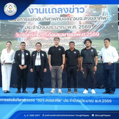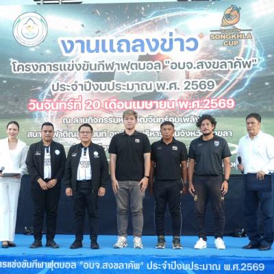 วันนี้ (20 เมษายน 2569) ที่สนามกีฬาติณสูลานนท์ จังหวัดสงขลา นายสุพิศ พิทักษ์ธรรม นายกองค์การบริหารส่วนจังหวัดสงขลา เป็นประธานงานแถลงข่าว โครงการแข่งขันกีฬาฟุตบอล “อบจ.สงขลาคัพ” ประจำปีงบประมาณ พ.ศ.2569 พร้อมด้วย นายทวีศักดิ์ อรัญดร ประธานสภาอบจ.สงขลา คณะผู้บริหาร สมาชิกสภา อบจ.สงขลา หัวหน้าส่วนราชการ สื่อมวลชนและแขกผู้มีเกียรติ โดยมีนายธนิศร์ ทองสุข เลขานุการองค์การบริหารส่วนจังหวัดสงขลา กล่าวถึงการสนับสนุนกีฬาและการส่งเสริมจังหวัดสงขลาสู่การเป็นเมืองกีฬา (Songkhla Sports City)