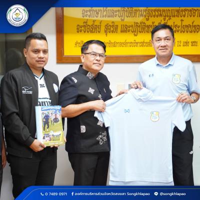นายสุพิศ พิทักษ์ธรรม นายกองค์การบริหารส่วนจังหวัดสงขลา พร้อมคณะผู้บริหาร ให้การต้อนรับ นายปิยะพงษ์ ผิวอ่อน กรรมการกลาง สมาคมกีฬาฟุตบอลแห่งประเทศไทย ในพระบรมราชูปถัมภ์ และประธานมูลนิธิพัฒนาฟุตบอลไทย ผู้จัด GLO CUP U13 พร้อมคณะ เพื่อหารือแนวทางยกระดับฟุตบอลสงขลา