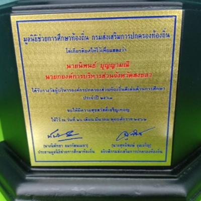 26 มีนาคม 2562 นายนิพนธ์ บุญญามณี นายกองค์การบริหารส่วนจังหวัดสงขลา เข้ารับโล่เกียรติยศจาก นางนิพัทธา อมรรัตนเมธา ประธานมูลนิธิช่วยการศึกษาท้องถิ่น ประเภทรางวัลผู้บริหารองค์กรปกครองส่วนท้องถิ่นดีเด่น ด้านการศึกษา โดยมีนายสันติธร ยิ้มละมัย รองอธิบดีกรมส่งเสริมการปกครองท้องถิ่น เป็นประธานในพิธี ณ ห้องธนบุรีฮอลล์ โรงแรมริเวอร์ไซด์ บางพลัด กรุงเทพมหานคร โดยมีคณะกรรมการมูลนิธิช่วยการศึกษาท้องถิ่น ผู้บริหารองค์กรปกครองส่วนท้องถิ่น ผู้อำนวยการสำนัก/กอง การศึกษาท้องถิ่น ผู้บริหารสถานศึกษาสังกัดองค์กรปกครองส่วนท้องถิ่น เข้าร่วมในพิธีมอบรางวัล ซึ่งมูลนิธิช่วยการศึกษาท้องถิ่น ร่วมกับกรมส่งเสริมการปกครองท้องถิ่น ได้จัดกิจกรรมครั้งนี้เพื่อเป็นการส่งเสริม และพัฒนาคุณภาพทางการศึกษาขององค์กรปกครองส่วนท้องถิ่น ให้มีประสิทธิภาพ เพื่อนำไปสู่การยกระดับคุณภาพชีวิต เสริมสร้างให้เด็กและเยาวชนของชาติ ให้เติบโตเป็นคนที่มีคุณภาพ และเป็นทรัพยากรที่สำคัญในการพัฒนาประเทศต่อไป และยังเป็นการส่งเสริมและพัฒนาคุณภาพประชากรขององค์กรปกครองส่วนท้องถิ่น ให้มีศักยภาพเพื่อก้าวสู่ประเทศไทย ๔.๐ ซึ่งถือเป็นการเตรียมความพร้อมของพลเมืองไทยในการพัฒนาประเทศ โดยความร่วมมือจากทุกภาคส่วน ทั้งภาครัฐบาล ภาคเอกชน และภาคประชาชน ในด้านการพัฒนาผู้เรียน ด้านบุคลากรทางการศึกษา ด้านงบประมาณ ด้านวิทยาการและเทคโนโลยี ทั้งนี้องค์การบริหารส่วนจังหวัดสงขลา ได้รับรางวัลผู้บริหารองค์กรปกครองส่วนท้องถิ่นดีเด่น ด้านการศึกษา ในฐานะที่ส่งเสริม และพัฒนาคุณภาพการศึกษาขององค์กรปกครองส่วนท้องถิ่น ซึ่งเป็นไปตามวัตถุประสงค์ของมูลนิธิช่วยการศึกษาท้องถิ่น