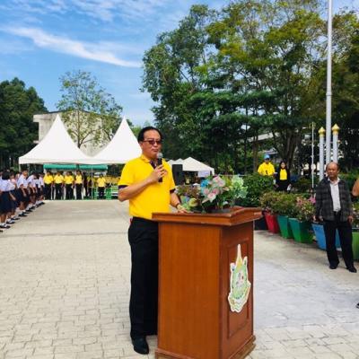 ผู้อำนวยการโรงเรียนเกาะแต้วพิทยาสรรค์ กล่าวต้อนรับผู้ร่วมโครงการปลูกต้นไม้เฉลิมพระเกียรติเนื่องในโอกาสวันเฉลิมพระชนมพรรษา 67 พรรษา