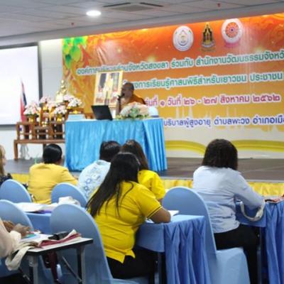 วันที่ 26 สิงหาคม 2562 นายประพันธุ์ ศรีสุวรรณ ปลัดองค์การบริหารส่วนจังหวัด ปฏิบัติหน้าที่ นายกองค์การบริหารส่วนจังหวัดสงขลา เป็นประธานในพิธีเปิด โดยนางหิรัญญา ศรีปานแก้ว รองปลัดองค์การบริหารส่วนจังหวัดสงขลา กล่าวรายงานโครงการเรียนรู้ศาสนพิธีสำหรับเยาวชน ประชาชน ประจำปี 2562 ณ ห้องประชุมติณสูลานนท์ ศูนย์บริบาลผู้สูงอายุ องค์การบริหารส่วนจังหวัดสงขลา