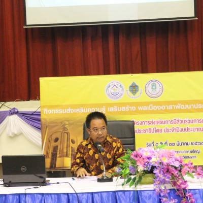 วันที่ 11 มีนาคม 2563 นายประพันธุ์ ศรีสุวรรณ ปลัดองค์การบริหารส่วนจังหวัด ปฏิบัติหน้าที่นายกองค์การบริหารส่วนจังหวัดสงขลา เป็นประธานเปิดโครงการส่งเสริมการมีส่วนร่วมการปกครองในระบอบประชาธิปไตย ประจำปีงบประมาณ 2563 รุ่นที่ 5 (กิจกรรมส่งเสริมความรู้ เสริมสร้าง พลเมืองอาสาพัฒนาประชาธิปไตย) โดยนายชัยวัฒน์ ชูเกิด ผู้อำนวยการกองกิจการสภาองค์การบริหารส่วนจังหวัดสงขลา กล่าวรายงานฯ ณ ห้องประชุมเทศบาลนครหาดใหญ่ อำเภอหาดใหญ่ จังหวัดสงขลา เพื่อให้ความรู้ ความเข้าใจเรื่องการเมืองการปกครองในระบอบประชาธิปไตยอันมีพระมหากษัตริย์ทรงเป็นประมุข ตระหนักถึงความสำคัญของความเป็นพลเมืองในระบอบประชาธิปไตย พร้อม ๆ กับบทบาทหน้าที่ของตนเองตามกฎหมาย รวมถึงสามารถพัฒนาตนเองให้พร้อมสู่การเป็นแกนนำในชุมชน