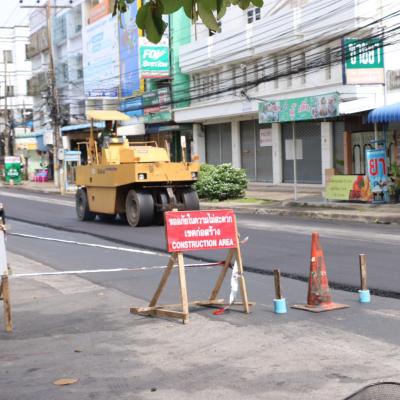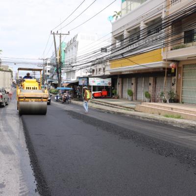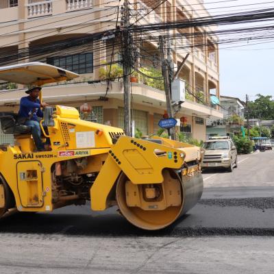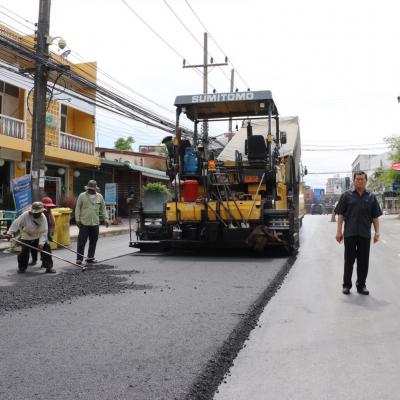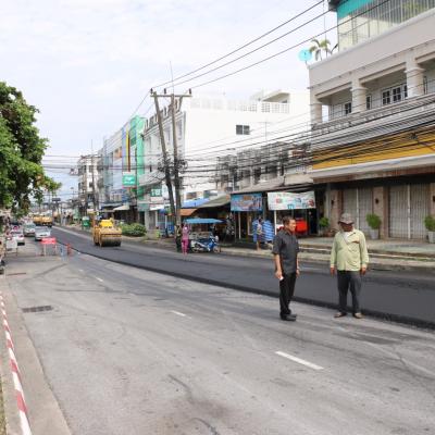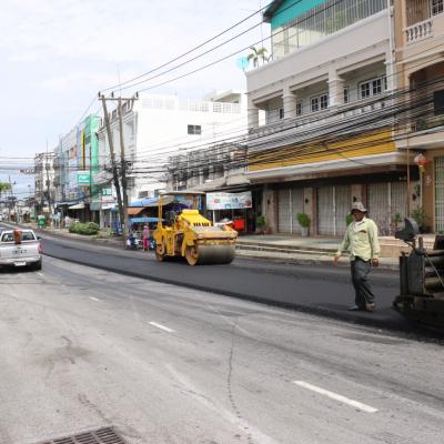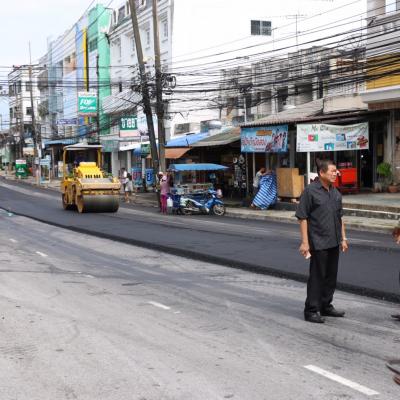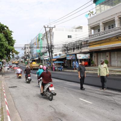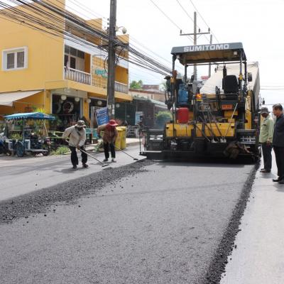 นายก อบจ.สงขลา เยี่ยมให้กำลังใจ คนงานที่กำลังเร่งปูพื้นผิวจราจร ลาดยางแอสฟัลท์ติกคอนกรีต ถนนเตาหลวง