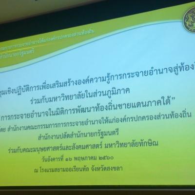 16 พค. 60 (8.00 น.) นายนิพนธ์ บุญญามณี นายก อบจ.สงขลา ให้การต้อนรับผู้อำนวยการสำนักงานการกระจายอำนาจให้องค์กรปกครองส่วนท้องถิ่น ที่มาร่วมเปิดการสัมนาร่วมกับมหาวิทยาลัยทักษิณ ในหัวข้อ การกระจายอำนาจในมิติการพัฒนาท้องถิ่นชายแดนภาคใต้ ซึ่งเป็นการประชุมเชิงปฏิบัติการเพื่อเสริมสร้างองค์ความรู้การกระจายอำนาจสู่ท้องถิ่น จัดโดยคณะกรรมการการกระจายอำนาจให้แก่องค์กรปกครองส่วนท้องถิ่น สำนักปลัดสำนักนายกรัฐมนตรี ร่วมกับคณะมนุษยศาสตร์มหาวิทยาลัยทักษิณ ณ โรงแรมสยามออเรียลทัล อ.หาดใหญ่ จ.สงขลา โดยนายจิรชัย มูลทองโร่ย ปลัดสำนักนายกรัฐมนตรีเป็นประธานในการเปิดการประชุม พร้อมด้วยผู้บริหาร บุคลากรจากมหาวิทยาลัยในส่วนภูมิภาค ผู้บริหาร ข้าราชการ และเจ้าหน้าที่จากองค์กรปกครองส่วนท้องถิ่นเข้าร่วมในการประชุม ทั้งนี้ เพื่อเป็นการส่งเสริมและบูรณาการการดำเนินงานกับมหาวิทยาลัยในส่วนภูมิภาค ในการใช้องค์ความรู้ และผลการวิจัยของมหาวิทยาลัยให้เกิดประโยชน์ ต่อการพัฒนางานการกระจายอำนาจที่สอดคล้องกับบริบทของท้องถิ่น และวิเคราะห์ สังเคราะห์องค์ความรู้ หรือผลงานการวิจัยของมหาวิทยาลัย ตามแนวทางประชารัฐ ในการจัดทำนโยบาย แผน แผนงาน และข้อเสนอแนวทางการพัฒนาการกระจายอำนาจสู่ท้องถิ่น และผลักดันให้เกิดการปฏิบัติที่เป็นรูปธรรม โดยดำเนินการผ่านคณะกรรมการการกระจายอำนาจ ให้แก่องค์กรปกครองส่วนท้องถิ่น
