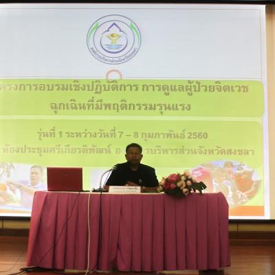 7 ก.พ.2560 เวลา 09.00 น. ที่ ห้องประชุมศรีเกียรติพัฒน์ องค์การบริหารส่วนจังหวัดสงขลา นายสมหมาย ขวัญทองยิ้ม รองนายกองค์การบริหารส่วนจังหวัดสงขลา เป็นประธานเปิดโครงการอบรมเชิงปฏิบัติการ หลักสูตร การดูแลผู้ป่วยจิตเวชฉุกเฉินที่มีพฤติกรรมรุนแรง (รุ่นที่1) ซึ่งจัดขึ้นระหว่างวันที่ 7-8 กุมภาพันธ์ 2560 โดยมีวัตถุประสงค์เพื่อป้องกันผลกระทบต่างๆ ที่จะเกิดขึ้นต่อชีวิตและทรัพย์สิน สร้างความปลอดภัยทั้งผู้ป่วย ครอบครัว บุคลากร และพัฒนาคุณภาพการให้บริการพยาบาลแก่ผู้ป่วย โดยมีอาจารย์วิราวรรณ ประยูรสวัสดิ์ หัวหน้างานจิตเวช กลุ่มงานจิตเวช และอาจารย์ประเสริฐ ไพบูลย์รุ่งโรจน์ อาจารย์ประจำภาควิชา จิตเวช มหาวิทยาลัยนราธิวาสราชนครินทร์ ร่วมบรรยาย หัวข้อ โรคทางจิตเวชที่พบบ่อยในภาวะวิกฤต ภาวะฉุกเฉินทางจิตเวช และการดูแลผู้ป่วยจิตเวชในภาวะฉุกเฉิน และให้ผู้เข้าร่วมอบรมได้ฝึกปฏิบัติการเจรจาต่อรอง ฝึกปฏิบัติเทคนิคการกำจัดพฤติกรรม สาธิต และทดลองปฏิบัติด้วย ซึ่งการอบรมเชิงปฏิบัติการในครั้งนี้ นับว่าเป็นการสนับสนุนการปฏิบัติงานของบุคลากรในระบบการแพทย์ฉุกเฉินให้มีศักยภาพในการช่วยเหลือผู้ป่วยจิตเวชได้อย่างมีประสิทธิภาพ และปลอดภัยมากยิ่งขึ้น
