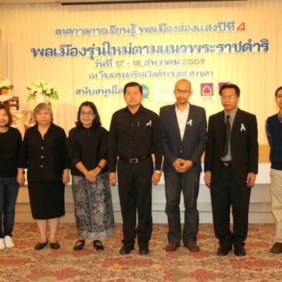18 ธ.ค.59 นายนิพนธ์ บุญญามณี นายก อบจ.สงขลา ประธานกล่าวเปิดงานเทศกาลการเรียนรู้ พลเมืองเยาวชนส่องแสง ปีที่ 4 พลเมืองรุ่นใหม่ตามแนวพระราชดำริ โดยมีผู้แทนมูลนิธิสยามกัมมาจล ผู้แทนสำนักงานกองทุนสนับสนุนการสร้างเสริมสุขภาพ ผู้อำนวยการสงขลาฟอร์รั่ม คณะที่ปรึกษาและผู้ทรงคุณวุฒิโครงกาจพลังพลเมืองเยาวชนสงขลา คณะครู ผู้ปกครองของเยาวชนทั้ง 26 กลุ่ม เข้าร่วมเปิดงาน ณ ห้องการะเกด โรงแรมกรีนเวิล์ด สงขลา โดยโครงการพลังพลเมืองเยาวชนสงขลา เป็นกระบวนการสร้างความร่วมมือในการสร้างพลเมืองเยาวชน ให้รู้สิทธิ หน้าที่ สิทธิชุมชน และทักษะการมีชีวิตอยู่ร่วมกัน โดยใช้พื้นที่เรียนรู้จากสถานการณ์จริงในโลกยุคใหม่