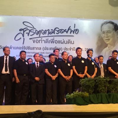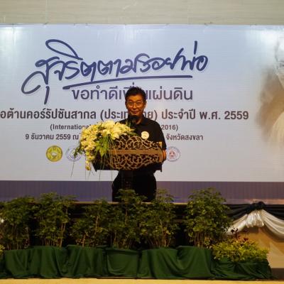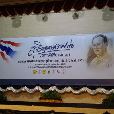 9 ธ.ค.59 นายสมหมาย ขวัญทองยิ้ม รองนายกองค์การบริหารส่วนจังหวัดสงขลา พร้อมด้วยบุคลากรในสังกัด ร่วมแสดงบูทนิทรรศการ และเป็นเกียรติในงานวันต่อต้านคอร์รัปชั่นสากล ประเทศไทย จังหวัดสงขลา ประจำปี พ.ศ.2559 ณ หอประชุมเทศบาลนครหาดใหญ่ อำเภอหาดใหญ่ จังหวัดสงขลา โดยในงานมีการนำเสนอวีดีทัศน์พระบรมราโชวาท พระราชดำรัส และพระราชกรณียกิจของพระบาทสมเด็จพระปรมินทรมหาภูมิพลอดุลยเดช เรื่องเล่า สุจริตตามรอยพ่อ ขอทำดีเพื่อแผ่นดิน การจัดนิทรรศการต้านโกง โดยสำนักงาน ป.ป.ช.ประจำจังหวัดสงขลา การจัดนิทรรศการองค์กรปกครองส่วนท้องถิ่นต้นแบบ-องค์กรปกครองส่วนท้องถิ่นดีเด่น ด้านการป้องกันการทุจริต การจัดนิทรรศการของส่วนราชการที่เกี่ยวข้อง พร้อมรับฟังการประกาศเจตนารมณ์ต่อต้านการทุจริต โดยพลเอก ประยุทธ์ จันทร์โอชา นายกรัฐมนตรี นอกจากนั้นสถานีวิทยุกระจายเสียงแห่งประเทศไทยจังหวัดสงขลา ยังได้ถ่ายทอดเสียงให้ประชาชนในพื้นที่ได้รับทราบอีกด้วย