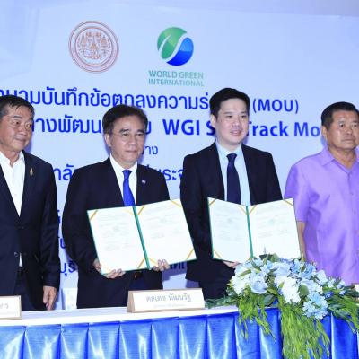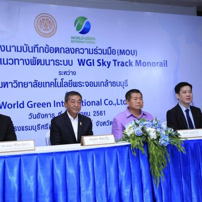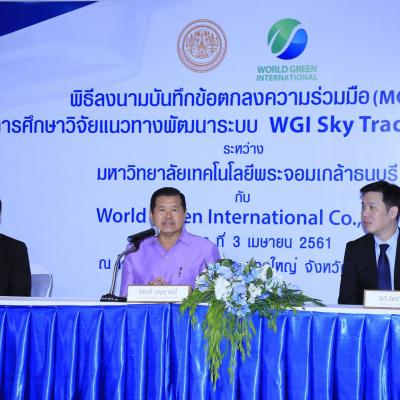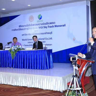 3 เมษายน 2561 องค์การบริหารส่วนจังหวัดสงขลา จัดพิธีลงนามบันทึกข้อตกลงความร่วมมือ (MOU) การศึกษาวิจัยแนวทางพัฒนาระบบ WGI Sky TRack Monorail ระหว่าง มหาวิทยาลัยเทคโนโลยีพระจอมเกล้าธนบุรี กับ World Green International Co.,Ltd. ณ ห้องราชาวดี โรงแรมบุรีศรีภู อ.หาดใหญ่ จ.สงขลา โดยมีนายดลเดช พัฒนรัฐ ผู้ว่าราชการจังหวัดสงขลาเป็นประธานในพิธีลงนาม พร้อมด้วยนายนิพนธ์ บุญญามณี นายกองค์การบริหารส่วนจังหวัดสงขลา หน่วยงานภาครัฐ เอกชน หน่วยงานที่เกี่ยวข้องและสื่อมวลชนเข้าร่วมเป็นสักขีพยานในพิธีลงนามทำ MOU ซึ่งบริษัท เวิลด์ กรีน อินเตอร์เนชั่นแนล จำกัด หรือ WIG ได้นำเทคโนโลยีรถไฟลอยฟ้า เป็นนวัตกรรมใหม่ล่าสุดที่ทันสมัย เน้นการอนุรักษ์พลังงาน และรักษาสิ่งแวดล้อมหรือกรีนเทคโนโลยี มาพัฒนาระบบคมนาคมรูปแบบใหม่ด้วย WGI Sky Track Monorail พร้อมส่งเสริมการลงทุนในภาคธุรกิจ พัฒนาเมืองในกลุ่มอาเซียนให้เป็น Green & Smart City โดยมีความมุ่งมั่นยืนหยัดที่จะรับผิดชอบต่อสิ่งแวดล้อมและสังคมเพื่อการเปลี่ยนแปลงที่ดีขึ้น ซึ่งมีเป้าหมายคือการส่งเสริมพัฒนาที่ยั่งยืน ดังนั้นวันนี้สิ่งที่เปลี่ยนไปคือเรื่องของเทคโนโลยี ซึ่งอบจ.สงขลา ในฐานะเจ้าของโครงการจึงอยากเห็นความชัดเจนของโครงการ ที่ฝ่ายนำเสนอมาว่าเป็นเทคโนโลยีใหม่ มีการลงทุนที่น้อยลง การดูแลบำรุงรักษาน้อยลงและเชื่อมั่นว่ามีความปลอดภัย สิ่งเหล่านี้ถ้าโครงการตอบโจทก์เหล่านี้ได้ มันก็จะมีผลกระทบกับโครงการในเชิงบวก นั่นคือค่าใช้จ่ายในการบริหาร การดูแลบำรุงรักษา ตลอดจนถึงการเก็บค่าโดยสารจากประชาชนก็จะถูกลงด้วย อันนี้คือผลประโยชน์ของพี่น้องประชาชนซึ่งเราต้องดูแลก่อน เมื่อเทคโนโลยีเปลี่ยนไป ประชาชนได้ประโยชน์มากขึ้น จึงค่อยมาตัดสินใจกัน กันว่าจะรับรองเทคโนโลยีที่เปลี่ยนไปหรือไม่