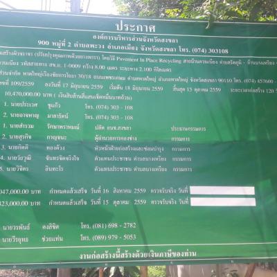 วันที่ 5 กันยายน 2559 นายนิพนธ์ บุญญามณี นายก อบจ.สงขลา มอบหมายให้กองช่างจาก อบจ.สงขลา โดยนายร่อเหตุ รักหมัด เลขานุการ นายก อบจ.สงขลา และนายสุรกิจ กาญจนะ ผอ.กองช่าง พร้อมด้วยเจ้าหน้าที่จากกองช่าง ดูความคืบหน้าการจ้างซ่อมสร้างผิวจราจร ปรับปรุงคุณภาพด้วยยางพารา โดยวิธี Pavement In Place Recycling สายบ้านควนเนียง ต.รัตภูมิ - บ้านบางเหรียง ต.บางเหรียง อ.ควนเนียง ระยะทาง 2.1 กิโลเมตร งบประมาณ 10,470,000 บาท