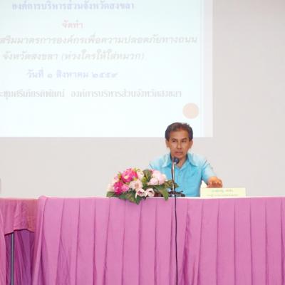 วันที่ ๑ สิงหาคม ๒๕๕๙ เวลา ๑๐.๐๐ น. นายสมหมาย ขวัญทองยิ้ม รองนายกองค์การบริหารส่วนจังหวัดสงขลา กล่าวต้อนรับ ผู้เข้าร่วมโครงการ “ส่งเสริมมาตรการองค์กรเพื่อความปลอดภัยทางถนนจังหวัดสงขลา (ห่วงใครให้ใส่หมวก)” ณ ห้องประชุมศรีเกียรติพัฒน์ องค์การบริหารส่วนจังหวัดสงขลา โดยนายเอกรัฐ หลีเส็น รองผู้ว่าราชการจังหวัดสงขลา เป็นประธานเปิดโครงการฯ ซึ่งการดำเนินการโครงการ“ส่งเสริมมาตรการองค์กรเพื่อความปลอดภัยทางถนนจังหวัดสงขลา (ห่วงใครให้ใส่หมวก)” สืบเนื่องมาจากคณะรัฐมนตรี ได้มีมติเมื่อวันที่ ๒๙ มิถุนายน ๒๕๕๓ กำหนดให้ปี ๒๕๕๔-๒๕๖๓ เป็นทศวรรษแห่งความปลอดภัยทางถนน และประกาศให้ปัญหาอุบัติเหตุทางถนนเป็นวาระแห่งชาติ หน่วยงานทุกภาคส่วนจึงต้องทำงานแบบบูรณาการร่วมกัน โดยรองผู้บังคับการตำรวจภูธรจังหวัดสงขลา ตัวแทนหน่วยงานภาคีเครือข่ายศูนย์อำนวยการความปลอดภัยทางถนน ตัวแทนองค์กรปกครองส่วนท้องถิ่น ข้าราชการ พนักงานองค์การบริหารส่วนจังหวัดสงขลา และผู้สนใจเข้าร่วมโครงการครั้งนี้