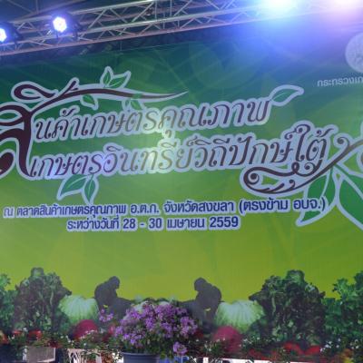 28 เมษายน 2559 เวลา 16.30 น. นายนิพนธ์ บุญญามณี นายก อบจ.สงขลา ร่วมในพิธีเปิดงานสินค้าเกษตรคุณภาพ เกษตรอินทรีย์วิถีปักษ์ใต้ ณ ตลาดสินค้าเกษตรคุณภาพ อ.ต.ก.สงขลา โดยมี พลเอกฉัตรชัย สาริกัลยะ รมต.กระทรวงเกษตรและสหกรณ์ เป็นประธานเปิดงาน พร้อมด้วยหน่วยงานภาครัฐและเอกชน เข้าร่วมในพิธีเปิด ซึ่งการจัดงานครั้งนี้ เป็นการบูรณาการร่วมกับหน่วยงานราชการ องค์กรปกครองส่วนท้องถิ่น องค์กรเครือข่ายเกษตรกร สภาเกษตรกรแห่งชาติ กองทุนฟื้นฟูและพัฒนาเกษตรกร เครือข่ายเกษตรกรชาวสวนยางในภาคใต้ ทั้งนี้ เพื่อส่งเสริมการผลิตสินค้าเกษตร ที่มีคุณภาพปลอดภัย ทั้งผู้ผลิตและผู้บริโภคสินค้าเกษตรอินทรีย์แบบวิถีชาวบ้าน และเกษตรอินทรีย์ที่ได้มาตรฐานสากล ซึ่งทางกระทรวงเกษตรและสหกรณ์ โดย อ.ต.ก.สงขลา ได้จัดหาตลาดเพื่อรองรับสินค้าที่เกษตรกรนำมาจำหน่าย พร้อมทั้งจัดกิจกรรมให้ผู้บริโภคพบผู้ผลิตโดยตรง ซึ่งจะเป็นการช่วยให้กลุ่มเกษตรกรมีช่องทางในการเสริมรายได้ เพิ่มทักษะและสร้างการเรียนรู้ด้านการตลาด ในการที่จะพัฒนาสินค้าให้ตรงกับความต้องการของผู้บริโภค รวมถึงการพัฒนาการผลิตสินค้าเกษตรให้มีคุณภาพปลอดภัย และก้าวสู่การเป็นเกษตรอินทรีย์ต่อไปในอนาคต