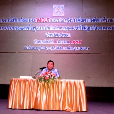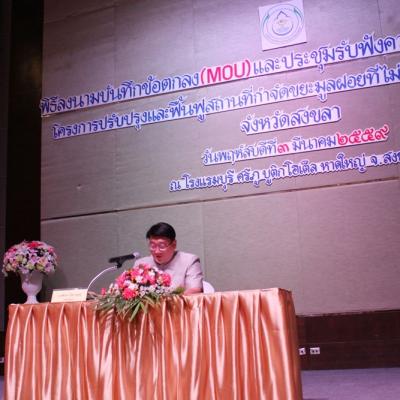 3 มีนาคม 2559 องค์การบริหารส่วนจังหวัดสงขลา ทำพิธีลงนามบันทึกข้อตกลง และประชุมรับฟังความคิดเห็นของประชาขน ในโครงการปรับปรุง และฟื้นฟูสถานที่กำจัดขยะมูลฝอยที่ไม่ถูกต้องตามหลักวิชาการ จังหวัดสงขลา โดยนายนิพนธ์ บุญญามณี นายก อบจ.สงขลา กล่าวรายงาน ในพิธีลงนาม และประชุมรับฟังความคิดเห็น ณ ห้องประชุมแกรนด์บอลรูม โรงแรมบุรีศรีภูบูติกโฮเต็ล อ.หาดใหญ่ จ.สงขลา โดยมี ปลัดจังหวัดสงขลา เป็นประธานเปิดงาน ซึ่งผู้เข้าร่วมประชุมประกอบด้วย อปท.28 แห่ง สำนักงานสิ่งแวดล้อมภาค 16 สงขลา สนง.ทรัพยากรธรรมชาติและสิ่งแวดล้อม บ.ที่ปรึกษา คณะผู้บริหาร และเจ้าหน้าที่จาก อบจ.สงขลา และประชาชนทั่วไปเข้าร่วมงานดังกล่าว ซึ่งการประชุมครั้งนี้ เป็นการดำเนินงาน เพื่อขับเคลื่อนนโยบายสำคัญของรัฐบาลด้านการแก้ไขปัญหาขยะมูลฝอยและของเสียอันตราย ซึ่งเป็นไปตามโรดแม็บ การจัดการขยะมูลฝอยและของเสียอันตรายที่คณะ คสช.ได้ให้ความเห็นชอบ ดังนั้น สนง.สิ่งแวดล้อมที่ 16 และ อบจ.สงขลา ได้เตรียมการสำรวจพื้นที่ และกำหนดรูปแบบการปรับปรุง และฟื้นฟูสถานที่กำจัดขยะมูลฝอยตามหลักวิชาการท และเพื่อให้การดำเนินโครงการเป็นไปได้อย่างมีประสิทธิภาพ อบจ.สงขลาจึงได้จัดให้มีการลงนามบันทึกข้อตกลงร่วมกัน เพื่อขับเคลื่อนการดำเนินการโครงการร่วมกับ อปท.ส่วนท้องถิ่น 28 แห่ง พร้อมทั้งรับฟังความคิดเห็นของประชาชนในครั้งนี้