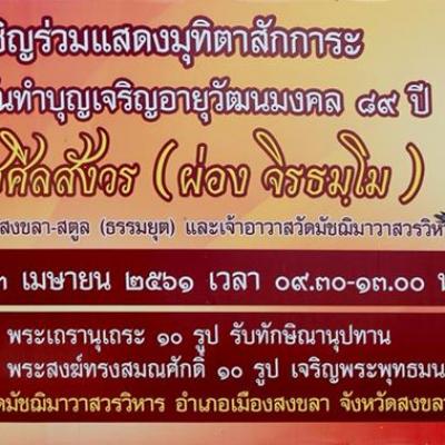 23 เมษายน 2561 นายนิพนธ์ บุญญามณี นายกองค์การบริหารส่วนจังหวัดสงขลา ถวายกระเช้าสุขภาพ เนื่องในงานทำบุญเจริญอายุวัฒนมงคล 89 ปี แด่พระเดชพระคุณ พระราชศีลสังวร (ผ่อง จิรธม.โม) ที่ปรึกษาเจ้าคณะจังหวัด สงขลา-สตูล (ฝ่ายธรรมยุต) เจ้าอาวาสวัดมัฌชิมาวาส (วัดกลาง) ต.บ่อยาง อ.เมือง จ.สงขลา โดยมีคณะสงฆ์และพุทธบริษัท ร่วมถวายมุทิตาสักการะแด่ พระศีลสังวร