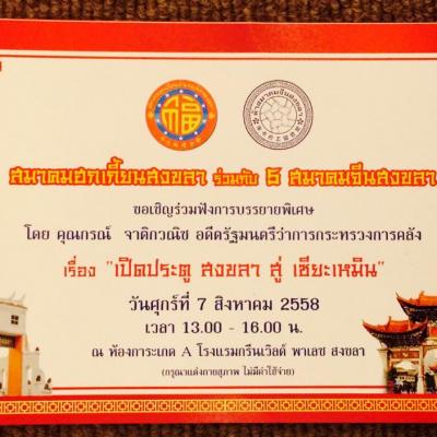 วันที่ 7 สิงหาคม 2558 นายนิพนธ์ บุญญามณี นายกองค์การบริหารส่วนจังหวัดสงขลา ร่วมรับฟังการบรรยายพิเศษ ซึ่งจัดโดยสมาคมฮกเกี้ยนสงขลา ร่วมกับ 5 สมาคมจีนสงขลา ในหัวข้อ เปิดประตูสงขลา สู่ เซียะเหมิน โดยนายกรณ์ จาติกวาณิช อดีต รมว.คลัง ณ ห้องประชุมโรงแรมกรีนเวิลด์สงขลา