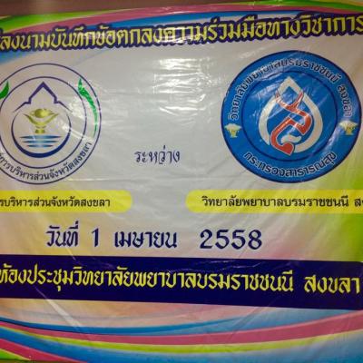วันที่ 1 มีนาคม 2558 บันทึกข้อตกลงความร่วมมือทางวิชาการด้านสาธาณสุข ระหว่าง องค์การบริหารส่วนจังหวัดสงขลา กับ วิทยาลัยพยาบาลบรมราชชนนีสงขลา โดยตกลงร่วมมือกันในการแลกเปลี่ยนข้อมูล เกี่ยวกับการสาธารณสุข การอนามัยครอบครัว การรักษาพยาบาล การวิจัย ตลอดจนการจัดกิจกรรมต่าง ๆ ร่วมกันตามความเหมาะสม เพื่อพัฒนาคุณภาพชีวิตของประชาชนในเขตพื้นที่ ทั้งด้านการป้องกันโรค การสร้างเสริมสุขภาพ การดูแลเด็ก การดูแลผู้สูงอายุ การฟื้นฟูสุขภาพผู้ป่วยเรื้อรังและผู้พิการ การรักษาพยาบาลเบื้องต้น การค้นหาปัญหาสุขภาพของประชาชนในพื้นที่ การวางแผนแก้ไขปัญหาสุขภาพของประชาชนในพื้นที่ ซึ่ง อบจ.สงขลา มีนโยบายด้านการพัฒนาคุณภาพชีวิต โดยสนับสนุนการพัฒนาคุณภาพชีวิตของเด็ก สตรี คนชรา คนพิการ และผู้ด้อยโอกาส ณ หอประชุมวิทยาลัยพยาบาลบรมราชชนนีสงขลา