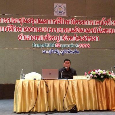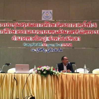 เมื่อวันที่ 12 กุมภาพันธ์ 2558 เวลา 13.00 น. นายนิพนธ์ บุญญามณี นายกองค์การบริหารส่วนจังหวัดสงขลา พร้อมด้วยคณะผู้บริหาร ส.อบจ.สงขลา เเละข้าราชการ อบจ.สงขลา ร่วมรับฟังความคิดเห็นจากผู้แทนหน่วยงานภาครัฐ ภาคประชาชน ผู้นำชุมชน นักศึกษา สื่อมวลชน กว่า 400 คน ใน โครงการศึกษาออกแบบระบบขนส่งมวลชนโดยระบบราง อำเภอหาดใหญ่ และปริมณฑล ครั้งที่ 3 ณ ห้องแกรนด์บอลรูม โรงแรมบุรีศรีภู บูติกโฮเต็ล หาดใหญ่