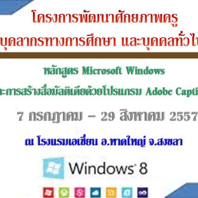 ภาพบรรยากาศในการฝึกอบรมตามโครงการพัฒนาศักยภาพครู บุคลากรทางการศึกษา และบุคคลทั่วไป หลักสูตร Microsoft Windows และการสร้างสื่อมัลติมิเดียด้วยโปรแกรม Adobe Captivate รุ่นที่ 4 ระหว่างวันที่ 25-29 กรกฎาคม 2557 ณ โรงแรมเอเชี่ยน อ.หาดใหญ่ จ.สงขลา ซึ่งจัดขึ้นโดย อบจ.สงขลา เป็นไปอย่างสนุกสนาน ในระหว่างการฝึกอบรมผู้เข้ารับการอบรมได้เรียนรู้เกี่ยวกับการสร้างงานสื่อมัลติมิเดียด้วยโปรแกรม Adobe Captivate จากทั้งภาคทฤษฎี และภาคปฏิบัติ โดยครบถ้วน ทั้งนี้องค์ความรู้เหล่านี้จะเป็นปัจจัยสำคัญในลำดับต้นๆที่ผู้เข้ารับการอบรมสามารถนำไปปรับใช้ในการพัฒนาสื่อนวัตกรรมต่างๆที่เกี่ยวข้องกับชีวิตประจำวันได้อย่างมีประสิทธิภาพ