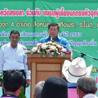วันนี้ (วันที่ 25 พฤษภาคม 2557) ณ สนามโรงเรียนสงขลาวิทยาคม ต.ชิงโค อ.สิงหนคร จ.สงขลา นายนิพนธ์ บุญญามณี นายก อบจ.สงขลา เป็นประธานเปิดการแข่งขันนกกรงหัวจุก ครั้งที่ 3 ชิงถ้วยรางวัลเกียรติยศจากนายก อบจ.สงขลา บริเวณโซนคาบสมุทรสทิงพระ ซึ่งประกอบด้วยพื้นที่ 4 อำเภอเป้าหมาย ได้แก่ อำเภอสิงหนคร อำเภอสทิงพระ อำเภอกระแสสินธ์ุ และอำเภอระโนด โดยมี นายประจักษ์ ชูแก้ว ประธานชมรมผู้เลี้ยงนกจังหวัดสงขลา เป็นผู้กล่าวรายงาน ร่วมด้วย ประธานชมรมผู้เลี้ยงนกกรงหัวจุก อ.สิงหนคร , ประธานชมรมผู้เลี้ยงนกกรงหัวจุก อ.สทิงพระ , ประธานชมรมผู้เลี้ยงนกกรงหัวจุก อ.กระแสสินธ์ุ , ประธานชมรมผู้เลี้ยงนกกรงหัวจุก อ.ระโนด และคณะกรรมการจัดการแข่งขัน ซึ่งบรรยากาศโดยรวมในวันนี้ได้รับการตอบรับจากกลุ่มผู้เลี้ยงนกกรงหัวจุกในพื้นที่ให้ความสนใจนำนกเข้าร่วมการแข่งขันเป็นจำนวนมาก
