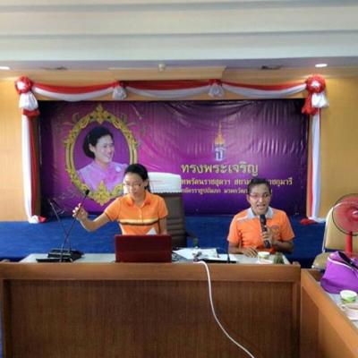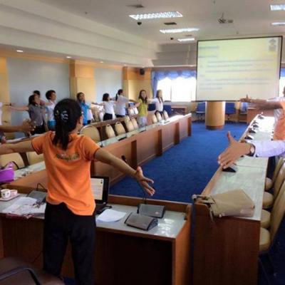 นอกจากนี้ยังได้มีการฝึกปฏิบัติการผ่อนคลายความเครียดจากการทำงาน ด้วยวิธีการหัวเราะบำบัด ซึ่งเป็นการออกกำลังกายไปพร้อมๆกับการฝึกเปล่งเสียง โดยวิทยากรได้มีการสาธิตการหัวเราะบำบัด และฝึกปฏิบัติร่วมกันกับผู้เข้ารับการอบรม ไม่ว่าจะเป็นการฝึกการออกกำลังกาย การฝึกลมหายใจเข้าออก การฝึกเปล่งเสียง และการฝึกทำสมาธิ ทั้งนี้บรรยากาศในการฝึกปฏิบัติเป็นไปอย่างสนุกสนาน