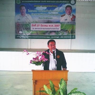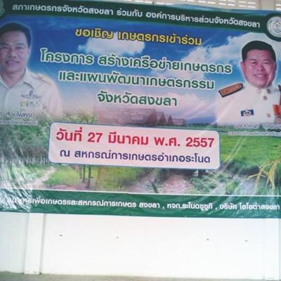 วันนี้ (วันที่ 27 มีนาคม 2557) ที่สหกรณ์การเกษตรระโนด จำกัด อบจ.สงขลา ร่วมกับ สำนักงานสภาเกษตรกร จังหวัดสงขลา จัดโครงการส่งเสริมศักยภาพเกษตรกร องค์กรเกษตรกร และพัฒนาเกษตรกรรมจังหวัดสงขลา ซึ่งมีกลุ่มเป้าหมายเป็นพี่น้องเกษตรกร สมาชิกองค์กรเกษตรกรจังหวัดสงขลา และประชาชนทั่วไปที่อาศัยอยู่ในพื้นที่โซนที่ 1 (คาบสมุทร) ประกอบด้วย อำเภอระโนด อำเภอกระแสสินธุ์ อำเภอสทิงพระ และอำเภอสิงหนคร โดยมีการบรรยายพิเศษในหัวข้อบทบาทหน้าที่ของเครือข่ายสภาเกษตรกร จำกัด และหัวข้อการจัดกิจกรรมระดมความคิดเห็นเกี่ยวกับการพัฒนาองค์กรการเกษตรและเครือข่ายที่เกิดจากการสะท้อนปัญหา และความต้องการของเกษตรกร ทั้งนี้เพื่อรวบรวมข้อมูลที่ได้ไปกำหนดเป็นแนวทางในการพัฒนา พร้อมทั้งบูรณาการเป็นแผนแม่บทเพื่อพัฒนาเกษตรกรรมของจังหวัดต่อไป