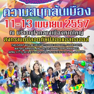 วันนี้ (วันที่ 26 มีนาคม 2557) ที่บริเวณหน้าห้างสรรพสินค้า ลีการ์เดนท์พลาซ่า หาดใหญ่ นายธนกร จันทร์สว่าง รองนายก อบจ.สงขลา ดร.ไพร พัฒโน นายกเทศมนตรีนครหาดใหญ่ สมาคมสมาพันธ์ธุรกิจการท่องเที่ยว จ.สงขลา การท่องเที่ยวแห่งประเทศไทย (ททท.) สำนักงานหาดใหญ่ และหน่วยงานต่างๆที่เกี่ยวข้อง ร่วมงานแถลงข่าว "Hatyai Midnight Songkran 2014 สงกรานต์ปลอดภัย ปลอดแอลกอฮอลล์" ซึ่งกำหนดจัดขึ้นในระหว่างวันที่ 11-13 เมษายน 2557 ณ บริเวณใจกลางเมืองหาดใหญ่ โดยมีนายพิรสิญจ์ พันธุ์เพ็ง รองผู้ว่าราชการจังหวัดสงขลา เป็นประธานฯ