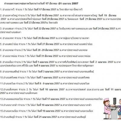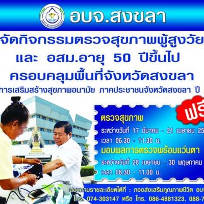 สำหรับในวันที่ 19 มีนาคม 2557 องค์การบริหารส่วนจังหวัดสงขลาขอเชิญผู้สูงวัย และอสม.ที่มีอายุ 5o ปีขึ้นไปในเขตพื้นที่อำเภอหาดใหญ่ จังหวัดสงขลา เข้ารับการตรวจสุขภาพฟรี ณ ศาลาเอนกประสงค์วัดน้ำน้อยนอก