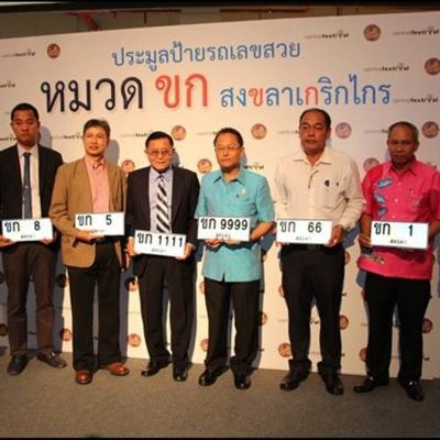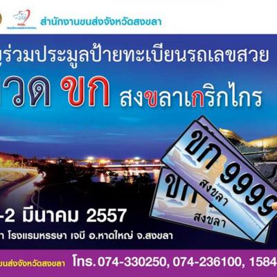 สำหรับการจัดงานประมูลป้ายรถเลขสวย “หมวดอักษร ขก สงขลาเกริกไกร ” กำหนดจัดขึ้นในระหว่างวันที่ 1-2 มีนาคม 2557 ณ ห้องสิรินภา โรงแเรมหรรษา เจ.บี. อำเภอหาดใหญ่ จังหวัดสงขลา (เริ่มตั้งแต่เวลา 09.00 น. เป็นต้นไป) โดยแบ่งกลุ่มเลขประมูลออกเป็น 3 กลุ่ม ประกอบด้วย กลุ่มที่มีตัวเลขเหมือนกัน 4 ตัว จำนวน 9 หมายเลข , กลุ่มที่มีตัวเลขเหมือนกัน 3 ตัว 2 ตัว เลขตัวเดียว เลขคู่ 8 และ 9 จำนวน 33 หมายเลข และ กลุ่มตัวเลขเหมือนกัน 2 คู่ เลขหลักพัน เลขเรียงลำดับ 3 ตัว 4 ตัว จำนวน 259 หมายเลข ทั้งนี้ผู้ที่สนใจสอบถามรายละเอียดเพิ่มเติมได้ที่สำนักงานขนส่งจังหวัดสงขลา หมายเลขโทรศัพท์ 0-7433-0250 , 0-7423-6100 และสายด่วน 1584
