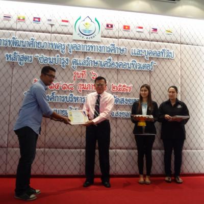เมื่อวันที่ 18 กุมภาพันธ์ 2557 พล.ต.ต.ธรัตน์ จันทรักษ์ ที่ปรึกษานายกองค์การบริหารส่วนจังหวัดสงขลา เป็นประธานมอบประกาศนียบัตรและปิดการฝึกอบรมโครงการพัฒนาศักยภาพครู บุคลากรทางการศึกษา และบุคคลทั่วไป หลักสูตร ซ่อมบำรุง รักษาเครื่องคอมพิวเตอร์ รุ่นที่ 6 (ระหว่างวันที่ 14 - 18 กุมภาพันธ์ 2557) ณ โรงแรมมายเฮาส์ อำเภอหาดใหญ่ จังหวัดสงขลา โดยหลักสูตรดังกล่าว ทางองค์การบริหารส่วนจังหวัดสงขลา ได้เริ่มจัดอบรมมาตั้งแต่วันที่ 20 มกราคม 2557 ซึ่งจะจัดไปเรื่อยจนกระทั่งถึงวันที่ 10 มีนาคม 2557 (จำนวน 10 รุ่น)