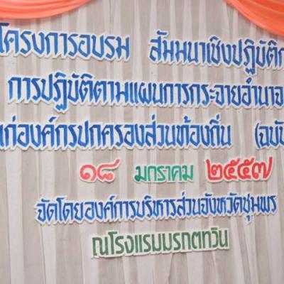 สำหรับการประชุมในครั้งนี้ ทางองค์การบริหารส่วนจังหวัดชุมพร ได้จัดให้มีขึ้น เพื่อชี้แจงและร่วมแสดงความคิดเห็นเกี่ยวกับการปฏิบัติตามแผนกระจายอำนาจให้แก่องค์กรปกครองส่วนท้องถิ่น (ฉบับที่ 3) และ แผนปฏิบัติการการกระจายอำนาจให้แก่องค์กรปกครองส่วนท้องถิ่น (ฉบับที่ 3) โดยมีผู้เข้าร่วมประชุมประกอบด้วย ผุู้บริหาร สมาชิกสภาฯ และเจ้าหน้าที่ที่เกี่ยวข้องขององค์กรปกครองส่วนท้องถิ่นในภาคใต้