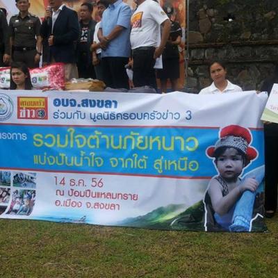 ในช่วงสายของวันที่ 14 ธันวาคม 2556 ณ สถานีตำรวจ สภอ.ภาค 9 สงขลา (บริเวณป้อมปืนแหลมทราย อ.เมือง จ.สงขลา) นายสมหมาย ขวัญทองยิ้ม รองนายก อบจ.สงขลา นายธนกร จันทร์สว่าง รองนายก อบจ.สงขลา และนายร่อเหตุ รักหมัด เลขานุการนายก อบจ.สงขลา นำทีมข้าราชการ พร้อมด้วยพนักงานในสังกัด ร่วมกันบริจาคเงินช่วยเหลือผู้ประสบภัยหนาวให้แก่สถานีวิทยุโทรทัศน์ไทยทีวีช่อง 3 (มูลนิธิครอบครัวข่าว 3 ) โดยผ่านทาง"โครงการรวมใจต้านภัยหนาวแบ่งปันน้ำใจจากใต้สู่เหนือ"