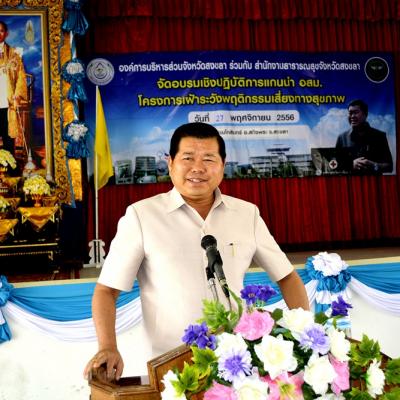 เมื่อเวลา 09.00 น. (วันที่ 28 พฤศจิกายน 2556 ) ณ ห้องประชุมศรีเกียรติพัฒน์ องค์การบริหารส่วนจังหวัดสงขลา นายนิพนธ์ บุญญามณี นายกองค์การบริหารส่วนจังหวัดสงขลา เป็นประธานในพิธีเปิดโครงการอบรมเชิงปฏิบัติการเฝ้าระวังพฤติกรรมเสี่ยงสุขภาพ โดยมีผู้เข้ารับการอบรมเป็นแกนนำอสม. และแกนนำสร้างเสริมสุขภาพในเขตอำเภอรัตภูมิ อำเภอบางกล่ำ อำเภอควนเนียง และอำเภอจะนะ ทั้งนี้ พล.ต.ต.ธรัตน์ จันทรักษ์ ที่ปรึกษานายกองค์การบริหารส่วนจังหวัดสงขลาเข้าร่วมงานในครั้งนี้ด้วย