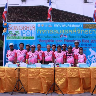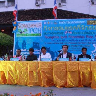 วันที่ 8 พฤศจิกายน 2556 เวลา 17.00 น. ณ บริเวณพิพิธภัณฑ์พธำมะรงค์ (ถนนคนเดินสงขลาแต่แรก) นายสมหมาย ขวัญทองยิ้ม รองนายกองค์การบริหารส่วนจังหวัดสงขลา เข้าร่วมงานแถลงข่าวกิจกรรมแรลลี่จักรยาน เส้นทางวัฒนธรรมเชื่อมความสัมพันธ์นานาชาติ "Songkhla Ipoh Friendship Ride 2013" โดยมีนายกฤษฎา บุญราช ผู้ว่าราชการจังหวัดสงขลา เป็นประธานในงานแถลงข่าวฯ พร้อมด้วยนายสมศักดิ์ ตันติเศรณี นายกเทศมนตรีนครสงขลา นางสาวจินตนา สุวรรณรัตน์ ผู้ช่วยผู้อำนวยการการท่องเที่ยวแห่งประเทศไทย สำนักงานหาดใหญ่ นายสุรพล กัมพลานนท์วัฒน์ ประธานสมาพันธ์ธุรกิจการท่องเที่ยวจังหวัดสงขลา นางสาวเมธาริน พงษ์รัชตะทารัณ ประธานชมรมจักรยาน Track Zone และนางธนพร ศิรินพงศ์ ประธานชมรมจักรยานเมืองสองทะเล เข้าร่วมงานแถลงข่าวในครั้งนี้ ซึ่งการจัดงานดังกล่าวจะกำหนดจัดขึ้นในระหว่างวันที่ 15-17พฤศจิกายน 2556 ณ ลานชมดาว บริเวณสระบัว แหลมสมิหลา จังหวัดสงขลา