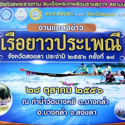 วันที่ 28 ต.ค.56 เวลา 10.30 น. ณ บริเวณท่าน้ำวัดบางหยี หมู่ที่ 4 ต.บางกล่ำ อ.บางกล่ำ จ.สงขลา นายนิพนธ์ บุญญามณี นายกองค์การบริหารส่วนจังหวัดสงขลา พร้อมด้วย นายบรรจง ช่วยชู นายอำเภอบางกล่ำ นายภาณุ วรมิตร ผู้อำนวยการการท่องเที่ยวแห่งประเทศไทย สำนักงานหาดใหญ่ และ นายบุญเจอ กัลยาศิริ สมาชิกสภาองค์การบริหารส่วนจังหวัดสงขลา ร่วมกันแถลงข่าวการจัดงานแข่งขันเรือยาวประเพณี จังหวัดสงขลา ครั้งที่ 18 ชิงถ้วยพระราชทานสมเด็จพระเทพรัตนราชสุดาฯ สยามบรมราชกุมารี พร้อมเงินรางวัลรวมกว่า 500,000 บาท ซึ่งกำหนดขึ้นในระหว่างวันที่ 2-3 พฤศจิกายน 2556 ณ บริเวณท่าน้ำบางหยี หมู่ที่ 4 ตำบลบางกล่ำ อำเภอบางกล่ำ จังหวัดสงขลา โดยแบ่งจัดการแข่งขันออกเป็น 5 ประเภท ประกอบด้วย การแข่งขันประเภท 12 ฝีพาย ประชาชนทั่วไป ชิงถ้วยพระราชทานสมเด้จพระเทพรัตนราชสุดาฯ สยามบรมราชกุมารี , การแข่งขันประเภท 9 ฝีพายประชาชนทั่วไป , การแข่งขันประเภท 9 ฝีพาย (จังหวัดพัทลุง,จังหวัดสงขลา) ,การแข่งขันประเภท 7 ฝีพาย ประชาชนทั่วไป และการแข่งขันประเภท 7 ฝีพาย เยาวชนอายุไม่เกิน 16 ปี โดยมีทีมสมัครเข้่าร่วมแข่งขันเป็นฝีพายจากจังหวัดพัทลุง นครศรีธรรมราช พังงาและจังหวัดสงขลา ซึ่งมีจำนวนประมาณ 43 ลำ (มากกว่าทุกปีที่ผ่านมา) ทั้งนี้การจัดการแข่งขันเรือยาวประเพณีข้างต้น ทางองค์การบริหารส่วนจังหวัดสงขลาได้จัดขึ้นต่อเนื่องมาเป็นประจำทุกปี โดยมีวัตถุประสงค์เพื่ออนุรักษ์ประเพณีการแข่งขันเรือยาวของอำเภอบางกล่ำที่สืบสานกันมาอย่างยาวนาน ควบคู่กับการส่งเสริมการท่องเที่ยวของจังหวัดสงขลให้เป็นที่รู้จักอย่างแพร่หลายา และสิ่งที่สำคัญประการหนึ่งของการจัดงานประเพณีเรือยาวดังกล่าว นั่นคือ เพื่อเป็นการปลูกจิตสำนึกให้เยาวชนรุ่นหลังได้เห็นถึงความสำคัญของวิถีชีวิตแบบดั้งเดิมที่มีความผูกพันกับสายน้ำมาอย่างยาวนาน อีกทั้งยังเป็นเครื่องบ่งบอกถึงความสมัครสมานสามัคคีของบุคคลที่ได้ชื่อว่าอยู่ในเรือลำเดียวกัน ไม่ว่าจะเป็นการฝึกฝน การทุ่มเทแรงกายแรงใจ ความพร้อมเพรียง และการประสานสัมพันธ์ที่ทำให้ไปสู่จุดหมายได้ โดยมิใช่อาศัยความสามารถของบุคคลใดบุคคลหนึ่ง ซึ่งสิ่งเหล่านี้สามารถนำไปปรับใช้กับการดำเนินชีวิตได้เป็นอย่างดี