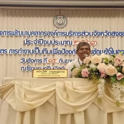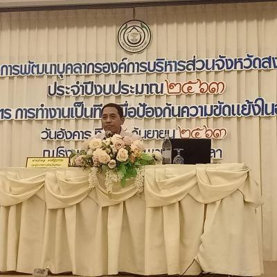 โดยที่โครงการพัฒนาบุคลากรองค์การบริหารส่วนจังหวัดสงขลา ประจำปีงบประมาณ 2563 หลักสูตรการทำงานเป็นทีมเพื่อป้องกันความขัดแย้งในองค์กร เป็นโครงการซึ่งกองกลางเจ้าหน้าที่ได้จัดขึ้น เพื่อให้ผู้เข้าร่วมรับการอบรม เกิดความตระหนักรู้ ในความสำคัญของการทำงานเป็นทีม เพื่อให้มีความรู้ ความเข้าใจ ถึงความต่างระหว่างบุคคล มีทัศนคติที่ดีในการมองปัญหา และสามารถปรับโลกทรรศ์ระหว่างกันได้ อีกทั้งให้ผู้เข้ารับการอบรม มีขวัญกำลังใจ และเสริมสร้างบรรยากาศเชิงบวกในการทำงาน รวมถึงมีจิตสำนึกด้านคุณธรรม จริยธรรมที่จำเป็นต่อการทำงาน และสามารถใช้เป็นเครื่องมือ ในการป้องกันไม่ให้เกิดการทุจริตขึ้นภายในองค์กร ผู้เข้ารับการอบรมประกอบด้วย หัวหน้าส่วนราชการ ผู้เชี่ยวชาญพิเศษ สมาชิกสภา อบจ. สงขลา ลูกจ้างประจำ และพนักงานจ้างรวม 700 คน ทั้งนี้เพื่อเป็นการส่งเสริมให้บุคลากร ซึ่งเป็นทรัพยากรที่ทรงคุณค่าขององค์กร ได้นำความรู้ จากโครงการมาขยายผลในทางปฏิบัติอย่างเป็นรูปธรรม ตลอดจนเกิดกระบวนการเรียนรู้ อันจะนำไปสู่การจัดการความขัดแย้งที่มีประสิทธิภาพ และประสิทธิผล อีกทั้งยังช่วยเสริมสร้างทัศนคติเชิงบวก เพื่อปรับเปลี่ยนพฤติกรรม หรือวิธีการทำงานร่วมกันเป็นทีมภายในองค์กรได้อย่างสร้างสรรค์