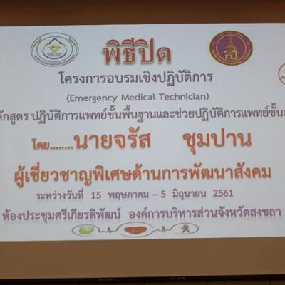 5 มิถุนายน 61 นายจรัส ชุมปาน ผู้เชี่ยวชาญพิเศษด้านการพัฒนาสังคม องค์การบริหารส่วนจังหวัดสงขลา เป็นประธานในพิธีปิดการอบรมเชิงปฏิบัติการ หลักสูตร ปฏิบัติการแพทย์ขั้นพื้นฐาน และช่วยปฏิบัติการแพทย์ขั้นสูง ณ ห้องประชุมศรีเกียรติพัฒน์ องค์การบริหารส่วนจังหวัด ตามแผนหลักการแพทย์ฉุกเฉินแห่งชาติ กำหนดหลักเกณฑ์การดำเนินงานและบริหารจัดการระบบการแพทย์ฉุกเฉิน ให้ อบจ. เป็นหน่วยงานหลักในการริหารจัดการด้านการแพทย์ฉุกเฉิน และประสานงานหน่วยงานต่าง ๆ ที่เกี่ยวข้อง มีการบริหารจัดการ มีชุดปฏิบัติการของตนเอง โดยเน้นชุดปฏิบัติการระดับ ALS และระบบช่วยเหลือผู้ป่วยฉุกเฉินวิกฤติ ณ จุดเกิดเหตุ (Stay and Play) และดำเนินการให้ชุดปฏิบัติการในองค์การบริหารส่วนตำบล เทศบาล หรือหน่วยงานอื่น ๆ สร้างการมีส่วนร่วมของประชาชนในการดูแลการเจ็บป่วยฉุกเฉินระดับครัวเรือน และชุมชน รวมถึงมีความจำเป็นต้องพัฒนากำลังคน สถาบันการศึกษา และฝึกอบรมด้านการแพทย์ฉุกเฉินให้เพียงพอ เพื่อการพัฒนาชุดปฏิบัติการให้ได้ ทั้งคุณภาพและปริมาณ โดยในปัจจุบันมีการขยายประเภทและจำนวนบุคลากรพื่อให้สามารถรองรับการป้องกันการเจ็บป่วยฉุกเฉิน การดูแลผู้ป่วยฉุกเฉินก่อนถึงโรงพยาบาล การดูแลผู้ป่วยฉุกเฉินในโรงพยาบาล และการดูแลระหว่างสถานพยาบาลในระบบส่งต่อ ซึ่งมีเป้าหมายในการยกระดับผู้ปฏิบัติการแพทย์ฉุกเฉินเบื้องต้น (EMR) เป็นเวชกรฉุกเฉินระดับต้น (EMT) เพิ่มขึ้นไม่น้อยกว่าร้อยละ 10 ต่อปี และจากผลงานของ อบจ.สงขลา ในปีที่ผ่านมา สามารถยกระดับผู้ปฏิบัติการฉุกเฉินเบื้องต้น เป็นเวชกรฉุกเฉินระดับต้น เพิ่มขึ้น 75 คน คิดเป็นร้อยละ 18.75 และยกระดับชุดปฏิบัติการฉุกเฉินเบื้องต้น เป็นชุดปฏิบัติการฉุกเฉินระดับต้น (Basic Life Support Unit : BLS) เพิ่มขึ้น 6 หน่วย คิดเป็นร้อยละ 5.61 ต่อปี