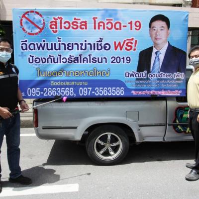 นายนิพัฒน์ อุดมอักษร เลขานุการนายกองค์การบริหารส่วนจังหวัดสงขลา และนายกสมาคมเอส.เอ็ม.อี. จังหวัดสงขลา กล่าวว่า วันนี้มาลงพื้นที่ฉีดยาฆ่าเชื้อเพื่อป้องกันการแพร่ระบาดของโรคโควิด-19 ให้กับพี่น้องประชาชนในอำเภอหาดใหญ่ ตามนโยบายการป้องกันการแพร่ระบาดของเชื้อโรค covid-19 วันนี้เราช่วยได้โดยการป้องกันเท่านั้น จึงอยากฝากพี่น้องประชาชนในอำเภอหาดใหญ่ ซึ่งขณะนี้มีผู้ติดเชื้อค่อนข้างมาก ดังนั้นถ้าสถานที่ใดต้องการให้ทางเราไปฉีดพ่นยาฆ่าเชื้อให้ ก็สามารถแจ้งมาได้ ซึ่งเราก็จะบริการฉีดพ่นยาฆ่าเชื้อให้ฟรี โดยไม่มีค่าใช้จ่ายใดๆ หรือท่านใดอยากยืมเครื่องมือไปฉีดที่บ้านก็แจ้งเข้ามาได้ เราจะมีเครื่องมือพร้อมน้ำยาให้ แต่ต้องรอเวลาสักระยะ เพราะตอนนี้มีคนจองมาค่อนข้างเยอะ จึงอยากฝากพวกเราทุกคนให้ช่วยกันดูแลป้องกันบ้านของเราไปด้วยกัน และหาดใหญ่ของเราต้องชนะ