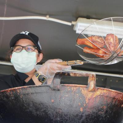 ทั้งนี้ นายนิพัฒน์ อุดมอักษร และนางสาวปรินดา ปาลาเร่ สองเลขานายก อบจ.สงขลา ร่วมปรุงอาหารและทอดไก่ ร่วมกับ พล.ท.เกรียงไกร ศรีรักษ์ แม่ทัพภาคที่ 4 เพื่อนำแจกจ่ายให้กับพี่น้องประชาชนในชุมชนปาดังเบซาร์ ที่มารอรับข้าวกล่อง และเครื่องอุโภคบริโภค บริเวณด่านศุลกากรปาดังเบซาร์
