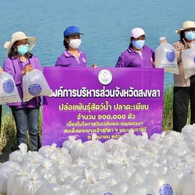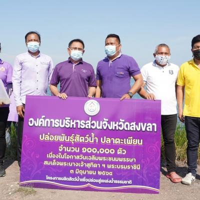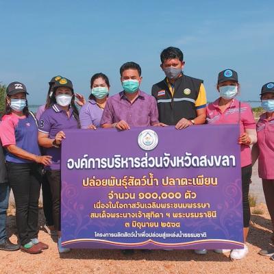วันที่ 3 มิถุนายน 2564 นายไพเจน มากสุวรรณ์ นายกองค์การบริหารส่วนจังหวัดสงขลา นำคณะผู้บริหาร สมาชิกสภาองค์การบริหารส่วนจังหวัดสงขลา หัวหน้าส่วนราชการ บุคลากรขององค์การบริหารส่วนจังหวัดสงขลา ผู้นำท้องที่ ผู้นำท้องถิ่น และประชาชนในพื้นที่ร่วมกิจกรรมปล่อยพันธุ์สัตว์น้ำ กุ้งก้ามกราม และปลาตะเพียน รวมทั้งสิ้น จำนวน 700,000 ตัว เนื่องในโอกาสวันเฉลิมพระชนมพรรษา สมเด็จพระนางเจ้าสุทิดา พัชรสุธาพิมลลักษณ พระบรมราชินี วันที่ 3 มิถุนายน 2564 ภายใต้โครงการผลิตสัตว์น้ำเพื่อปล่อยสู่แหล่งน้ำธรรมชาติ 3 แห่ง ได้แก่ จุดที่ 1 สถานที่แก้มลิง หมู่ที่ 1 ต.ชะแล้ ปล่อยปลาตะเพียน จำนวน 1 แสนตัว จุดที่ 2 แก้มลิง หมู่ที่ 2 ต.บางเขียด ปล่อยปลาตะเพียน จำนวน 1 แสนตัว และจุดที่ 3 บริเวณวัดแหลมหาด หมู่ที่ 6 ต.เกาะใหญ่ อ.กระแสสินธุ์ ปล่อยกุ้งก้ามกราม จำนวน 5 แสนตัว พร้อมมอบเครื่องวัดอุณหภูมิ และหน้ากากอนามัย ให้กับ อสม.ซึ่งเป็นบุคลากรด่านหน้าในชุมชุนอีกด้วย การจัดกิจกรรมในครั้งนี้ ได้ปฏิบัติตามมาตรการป้องกันการแพร่ระบาดของโรคติดเชื้อไวรัสโคโรนา 2019 อย่างเคร่งครัด