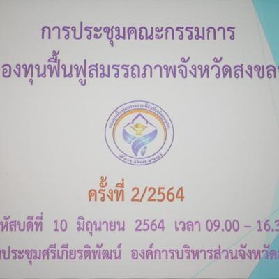 วันที่ 10 มิถุนายน 2564 นายไพเจน มากสุวรรณ์ นายกองค์การบริหารส่วนจังหวัดสงขลา เป็นประธานการประชุมคณะกรรมการกองทุนฟื้นฟูสมรรถภาพจังหวัดสงขลา ครั้งที่ 2/2564 ณ ห้องประชุม ชั้น 2 อาคารศรีเกียรติพัฒน์ องค์การบริหารส่วนจังหวัดสงขลา เพื่อสรุปผลการดำเนินงานกองทุน ฯ ไตรมาส 2 ประจำปี 2564 และเพื่อพิจารณาการขออนุมัติดำเนินโครงการต่าง ๆ ของกองทุนฟื้นฟูฯ