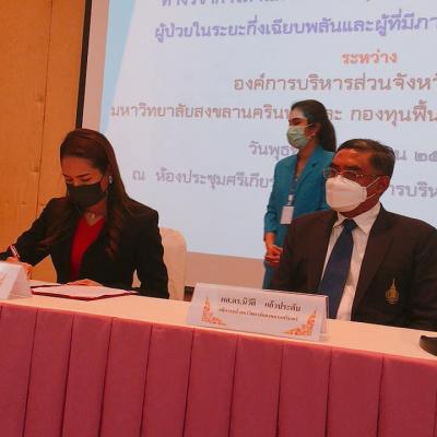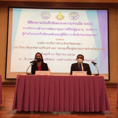วันที่ 16 มิถุนายน 2564 นายไพเจน มากสุวรรณ์ นายกองค์การบริหารส่วนจังหวัดสงขลา ในฐานะประธานกองทุนฟื้นฟูสมรรถภาพจังหวัดสงขลา มอบหมายให้นางสาวสุภาพร กำเนิดผล รองนายกองค์การบริหารส่วนจังหวัดสงขลา เป็นตัวแทนในพิธีลงนามบันทึกข้อตกลงความร่วมมือทางวิชาการด้านการพัฒนาคุณภาพชีวิตผู้สูงอายุ คนพิการ ผู้ป่วยในระยะกึ่งเฉียบพลัน. และผู้ที่มีภาวะพึ่งพิงจังหวัดสงขลา ระหว่างองค์การบริหารส่วนจังหวัดสงขลา มหาวิทยาลัยสงขลานครินทร์ และ กองทุนฟื้นฟูสมรรถภาพจังหวัดสงขลา เพื่อร่วมมือกันดำเนินการพัฒนาระบบการสนับสนุน การดูแลช่วยเหลือ และการฟื้นฟูสมรรถภาพผู้สูงอายุ คนพิการ ผู้ป่วยในระยะกึ่งเฉียบพลัน และผู้ที่มีภาวะพึ่งพิงในจังหวัดสงขลาแบบครบวงจร เพื่อยกระดับคุณภาพชีวิตของกลุ่มเป้าหมายให้ดีขึ้น
